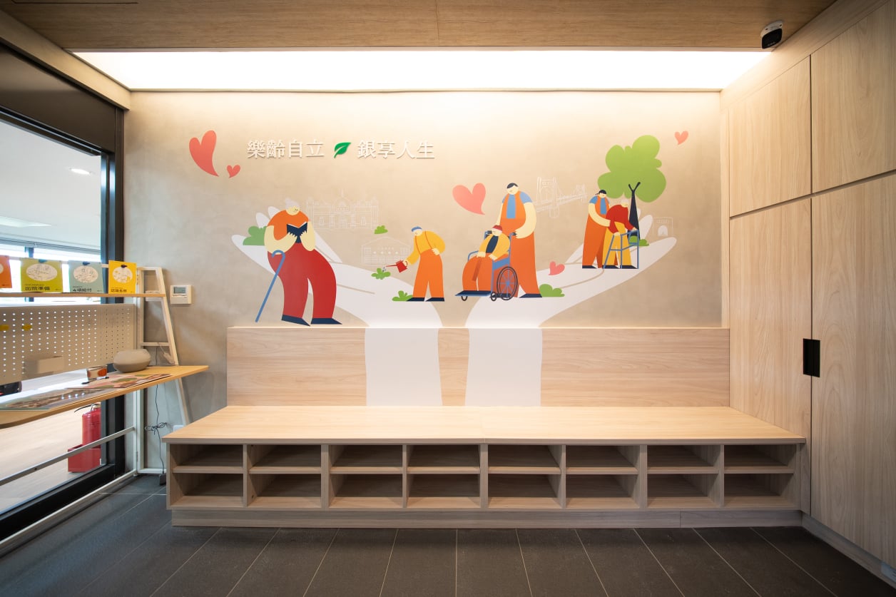 入口主視覺牆融入大溪木藝意象與在地人文風景,透過插畫描繪日常照顧、田園活動與「第三人生」的自在樣貌——這不只是一面牆,而是一種對老後生活的想像:不只是被照顧,而是依然擁有參與與價值。