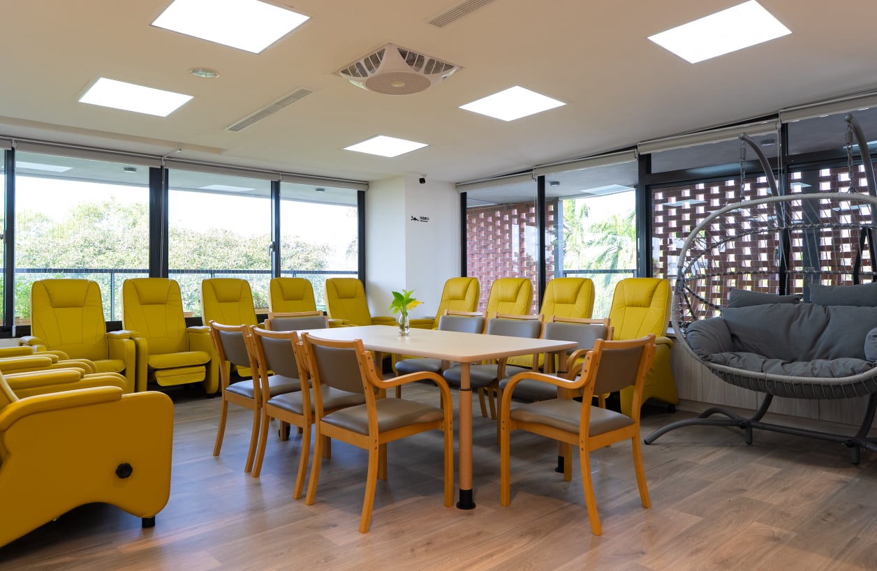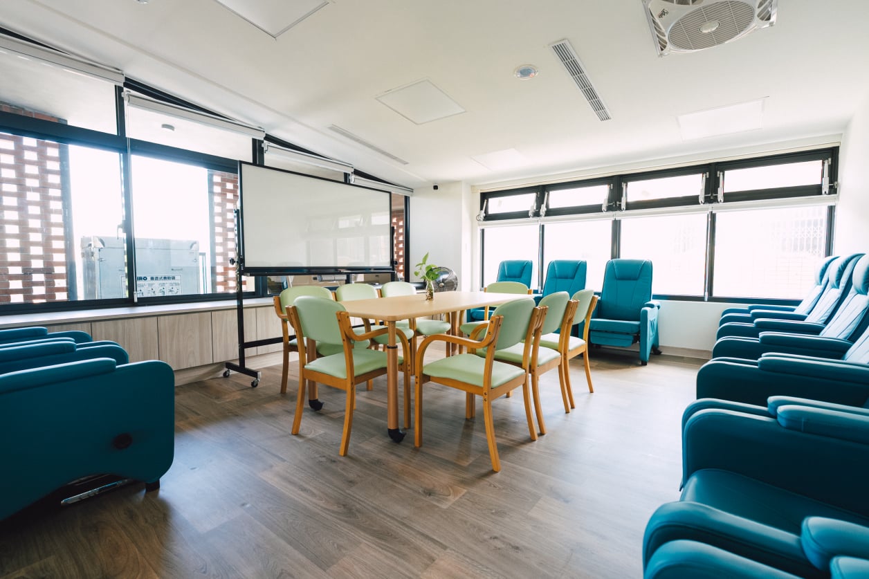 室內空間規劃寬敞活動區、專業照顧單元與舒適交流角落,動線安全、環境友善,讓長輩在熟悉節奏中參與團體活動、進行健康促進課程、維持生活功能與自立能力。