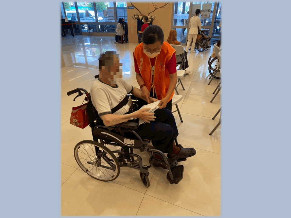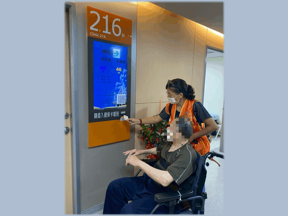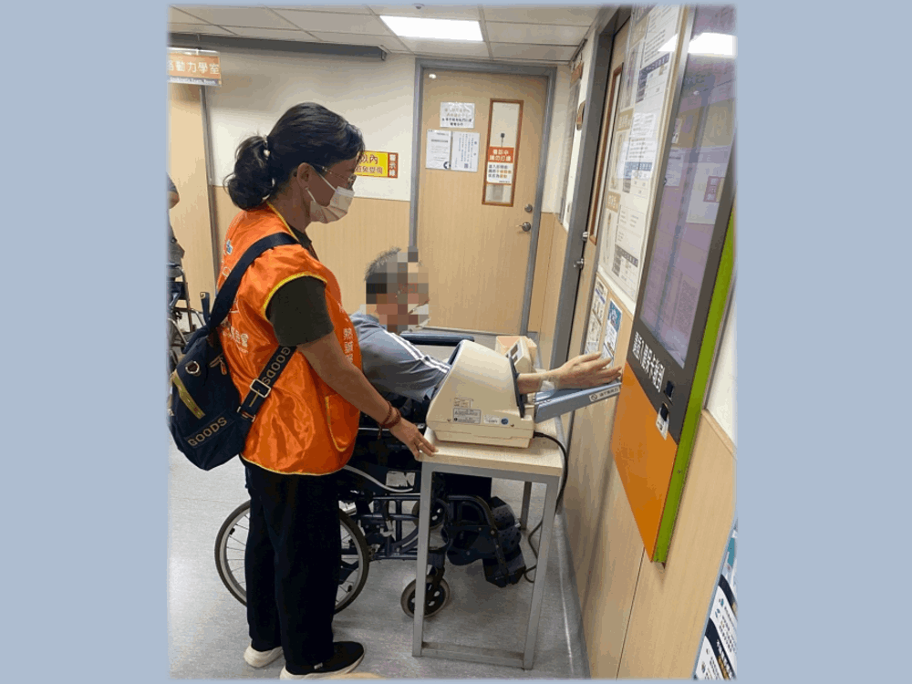 ▲陪醫員耐心協助長輩報到看診