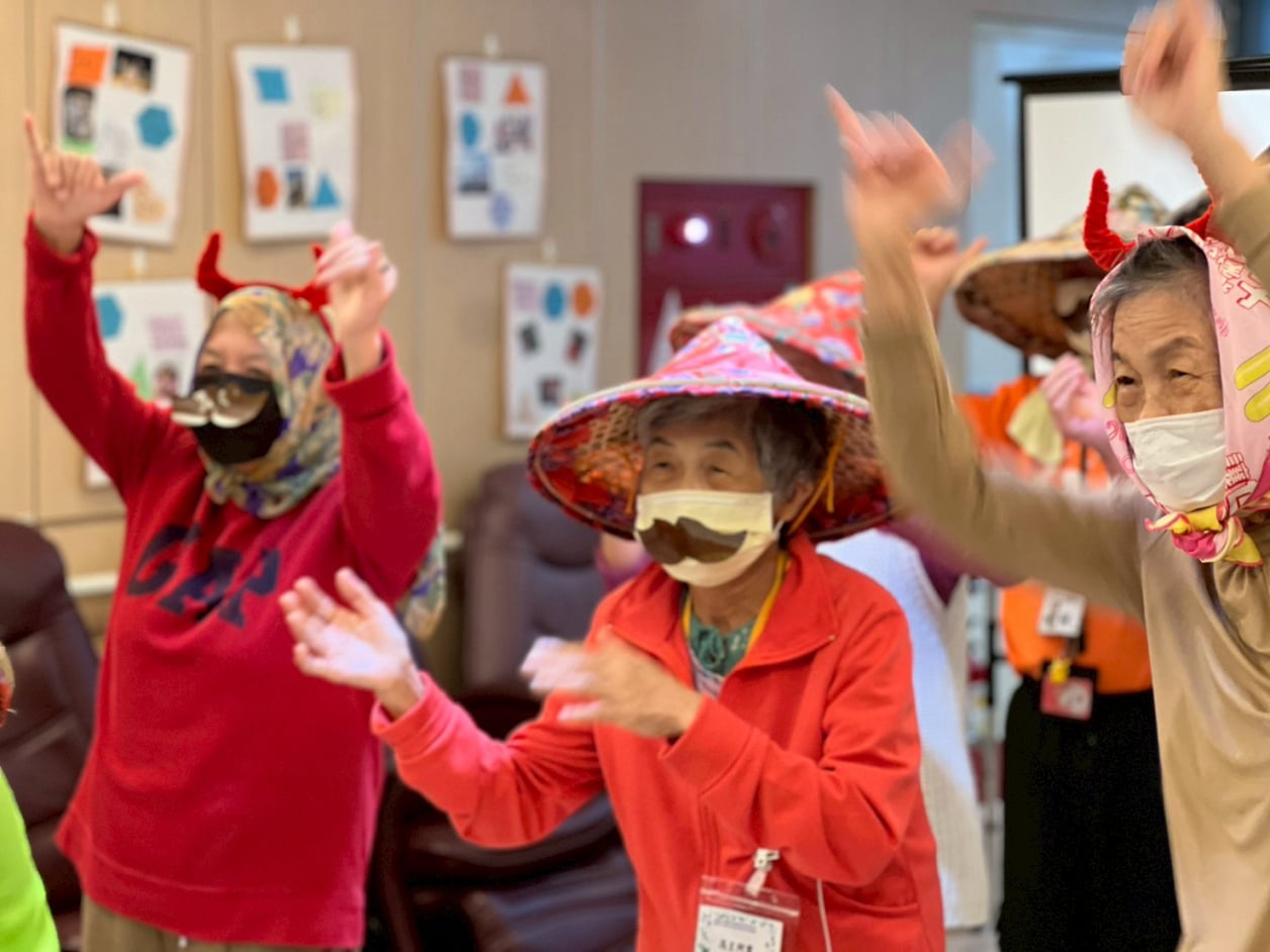 活動氣氛在照服員帶領的〈阿爸牽水牛〉帶動跳中再度升溫。熟悉的旋律一響起,長輩們紛紛隨節奏擺動,笑聲不斷,彷彿回到青春時光般自在。